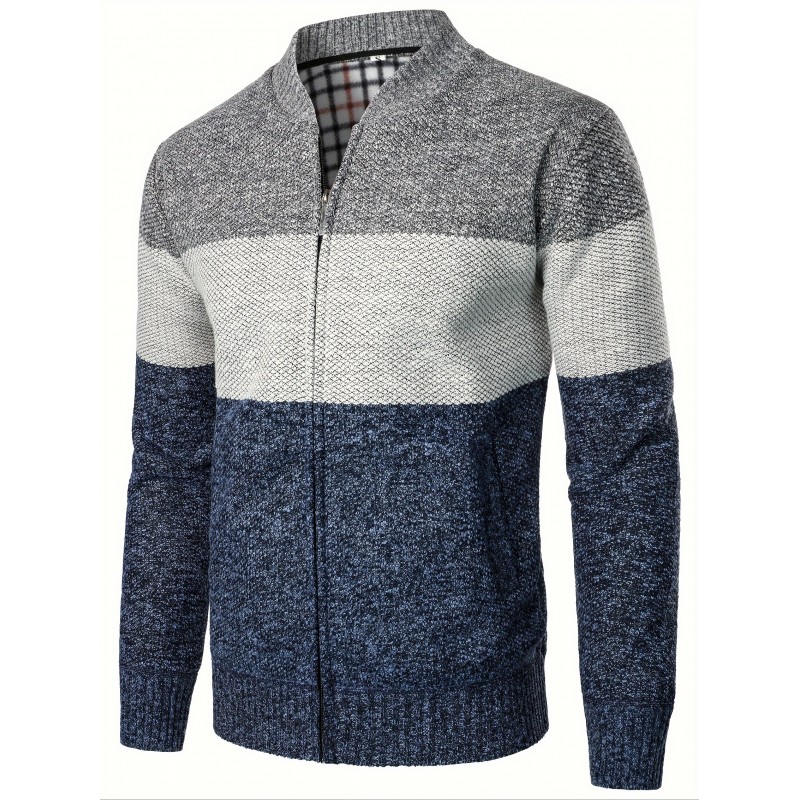 Warm Stand Collar Fleece Jacket, Men's Casual Comfortable Color Block Mid Stretch Zip Up Knitted Cardigan For Spring Fall