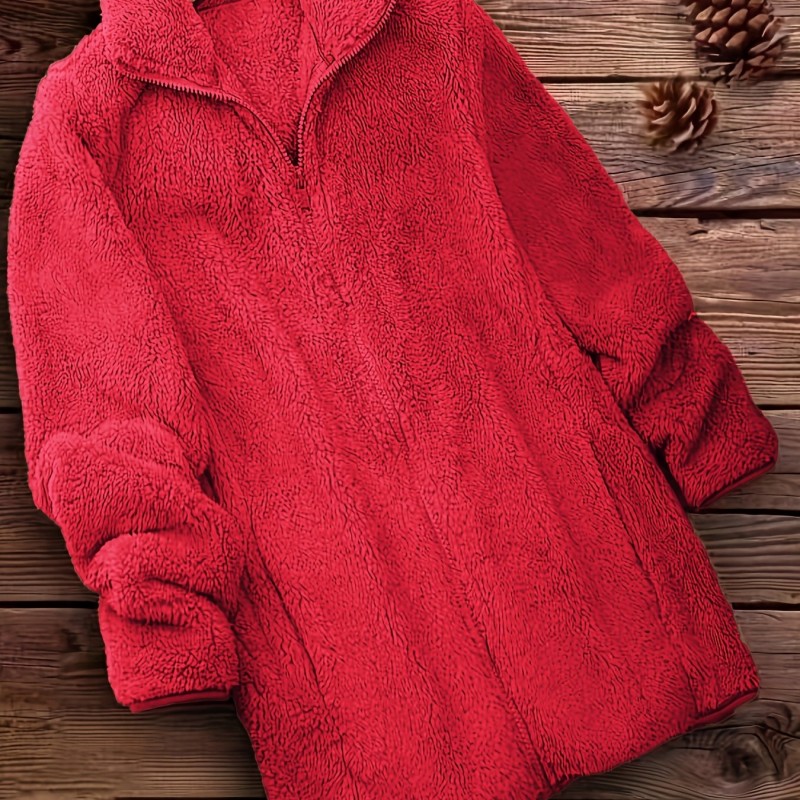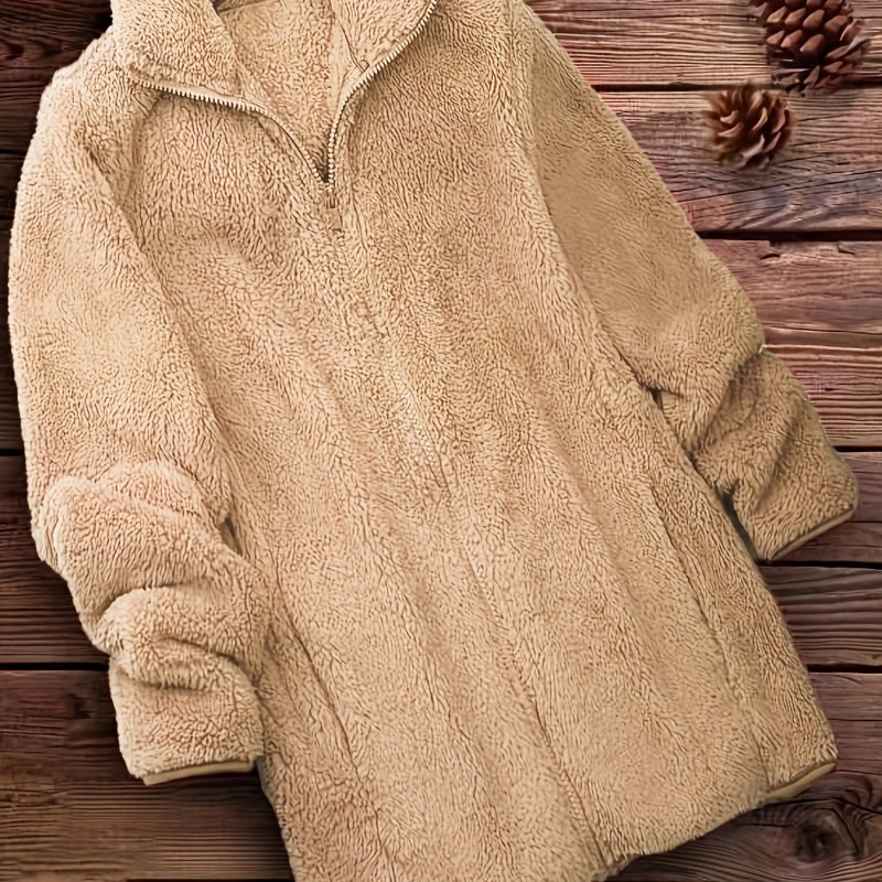Zip Up Solid Teddy Coat, Casual Long Sleeve Winter Outerwear, Women's Clothing